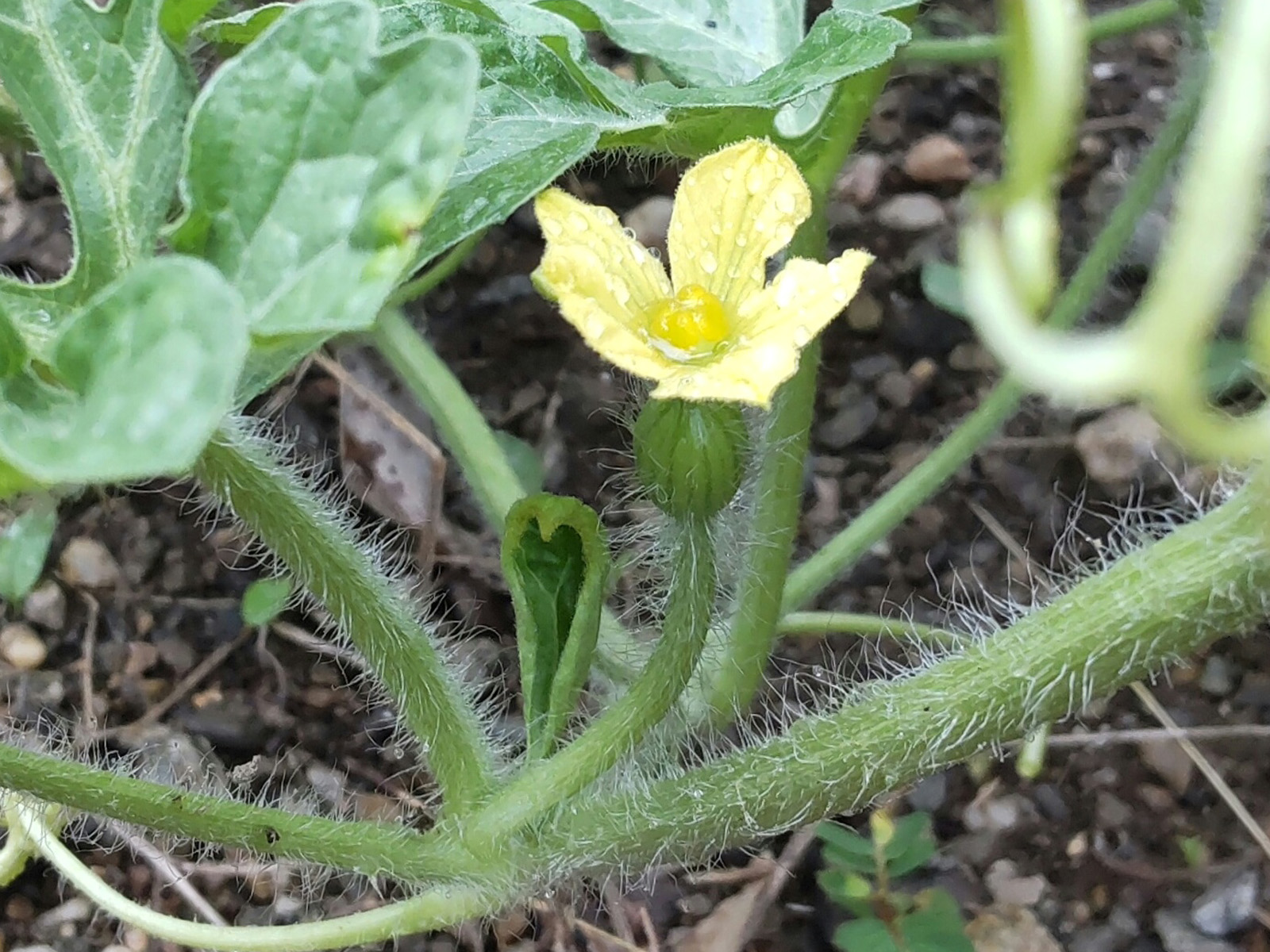 このところ雄花は毎日のように咲いてたけど、雌花が今日初めて咲きました😊が、しかし雨に濡れてて花粉がつけられない😂