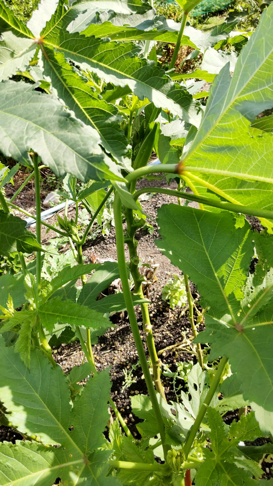 茎が太いオクラも、ほぼ真っ直ぐ伸びてた葉が90度近く風で曲がった😆