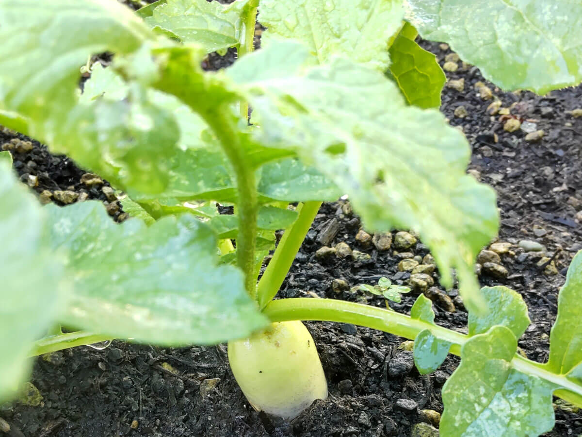 先月末の台風で、ミニ大根さんの芽は3分の1くらい折れたけど、そのうちの半分が復活して、そろそろ収穫くらいまで生長したけど、また肥料やりすぎたかも。。。