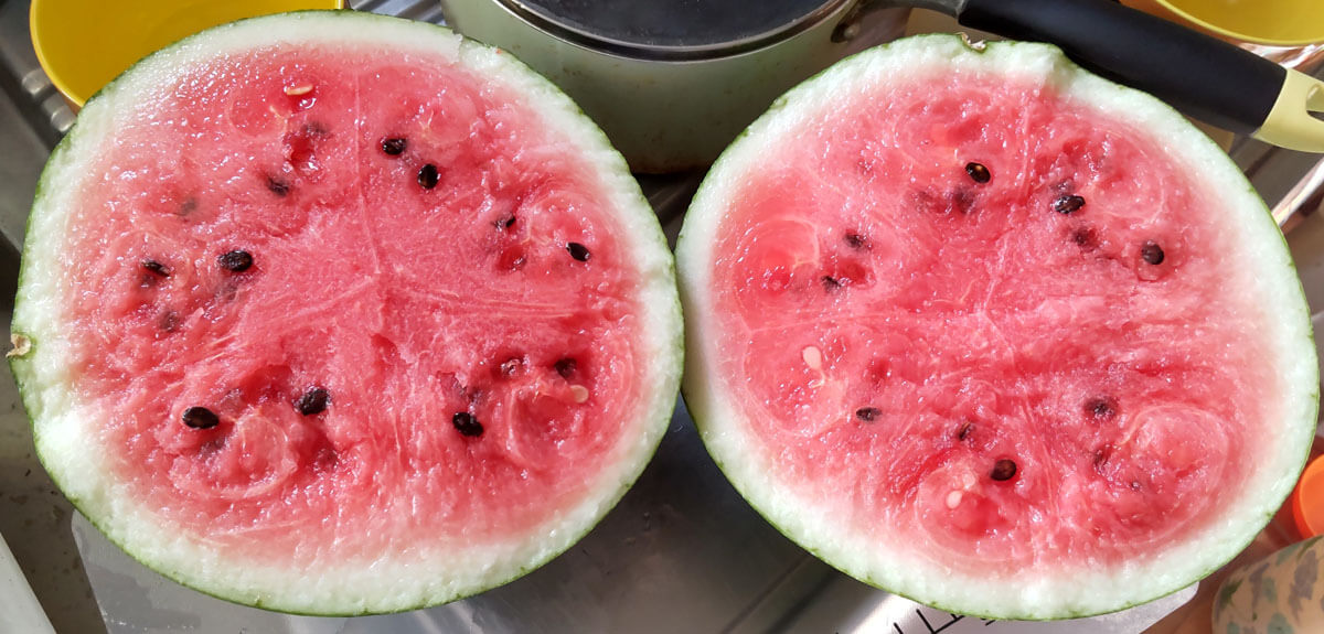 薄く切って味見したところ、冷やしてないのに冷たくて、すごく甘いというわけではないけど、そこそこ甘かったので、味はまあなんとか大丈夫そうだけど、見た目は熟れすぎ??