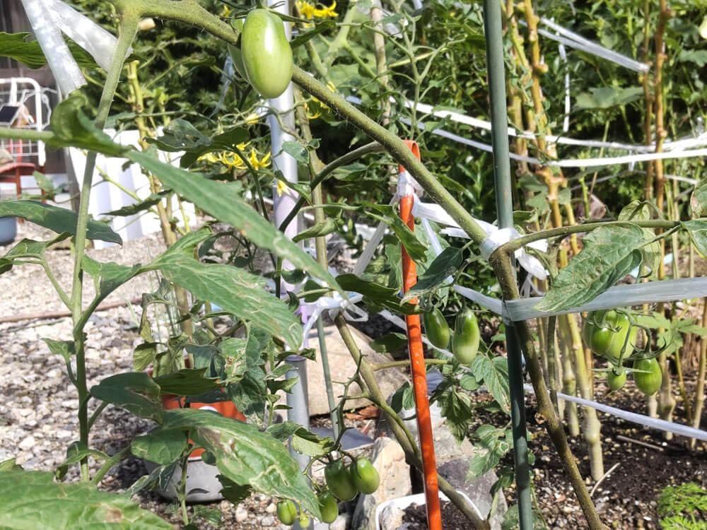 秋になり、畑の端が昼間は近所の家の影になるようになり、日照不足のミニトマトのアイコちゃん。