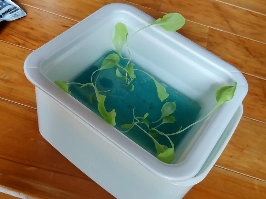 室内で育てて全滅していたと思われていたサニーレタスが、一つ水の交換し忘れてて、水が空になりそうなのが生き残っていました😂