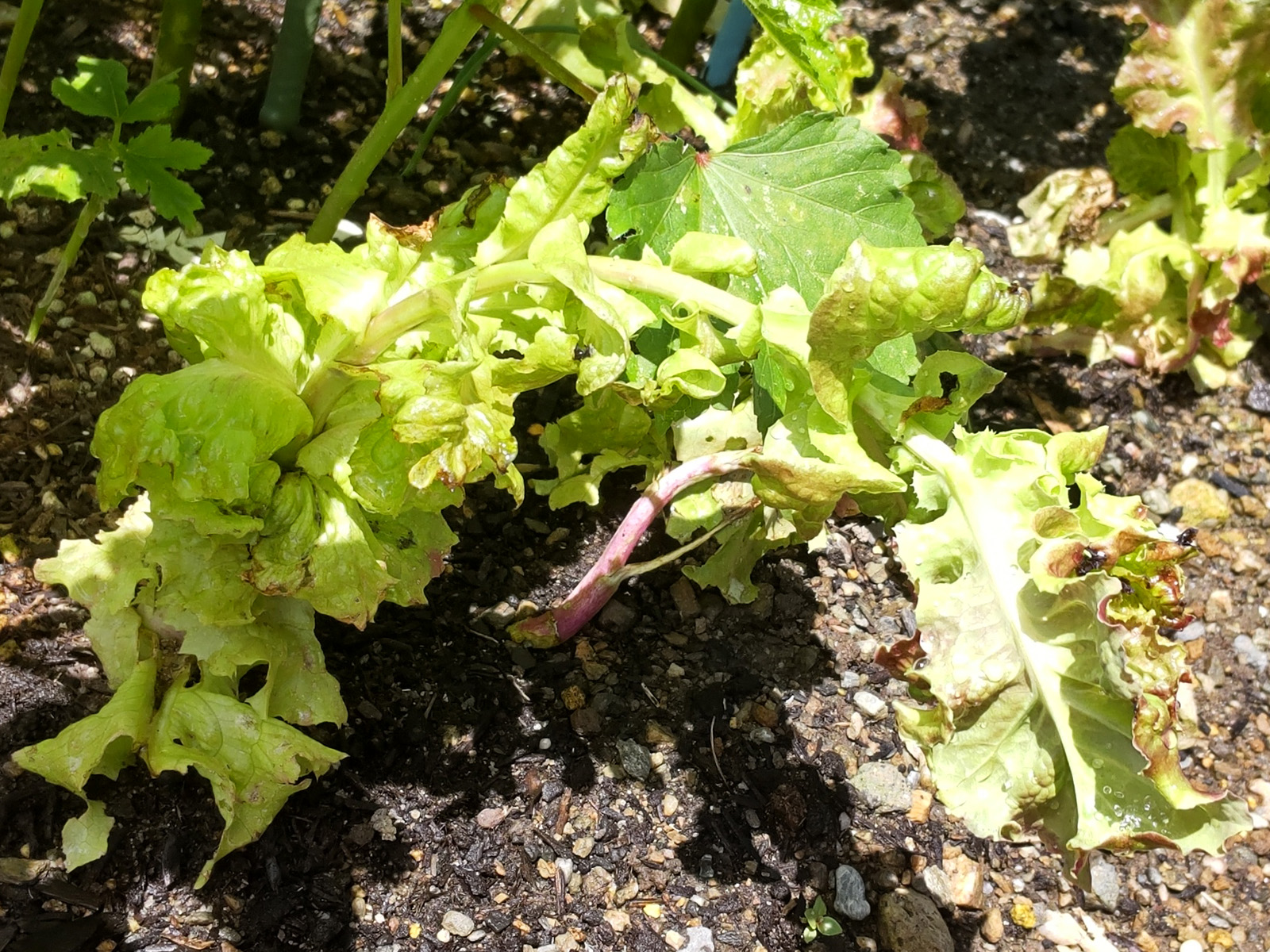 あと、大雨でダンゴムシに食べられてたサニーレタス、いろいろな形で復活してます。一つの芯からまた芯が2本生えてたり、芯が30㎝くらい伸びて倒れた後、元々の根はダメになってるけど、倒れた接地面からまた根が生えて先っちょに新たな葉が生えたりと、以外とタフですね😆
