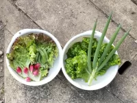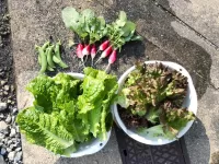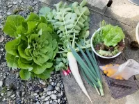 今日のお裾分けは、結球しなかった白菜と大根・はつか大根・巨大化した小ネギ・水菜・チマサンチュ・サニーレタス・金柑です😊