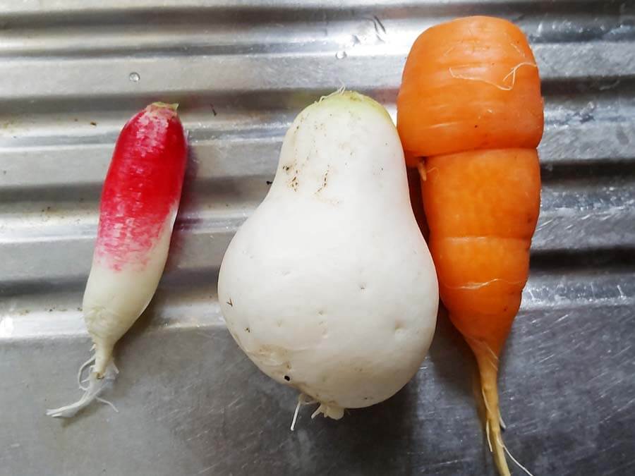 今日のお裾分けは、紅白はつか大根・ミニ大根・五寸人参です。