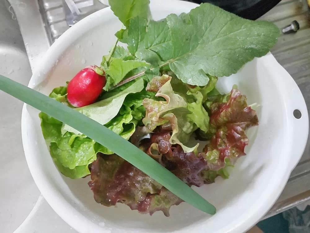 今日のお裾分けは、紅白はつか大根とネギとサニーレタスとチマサンチュです😊