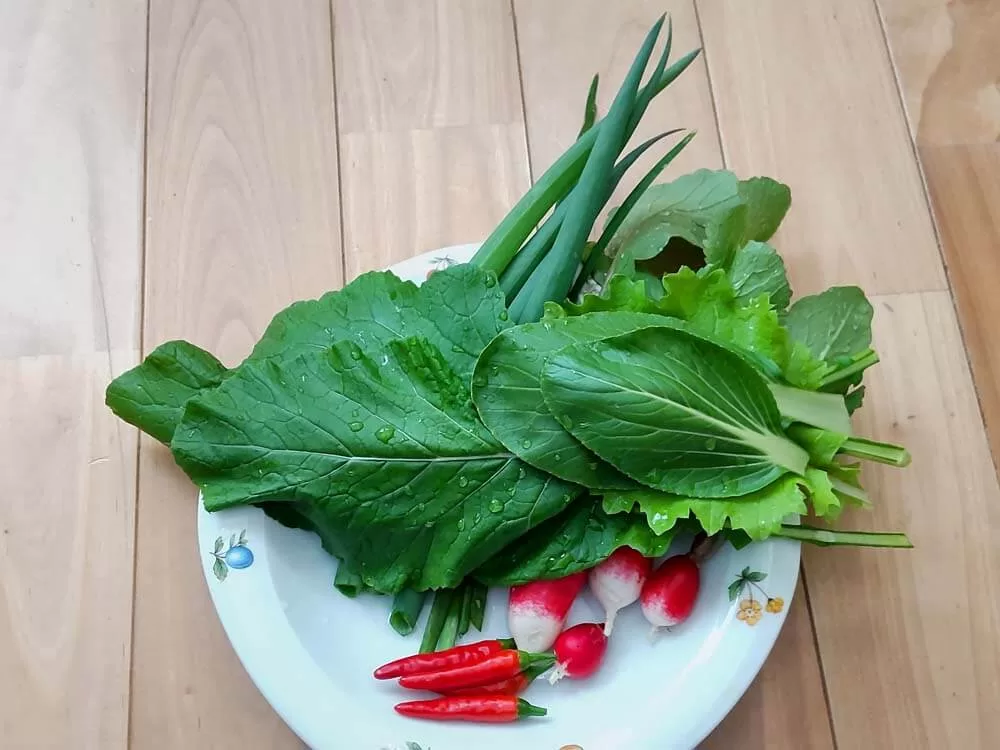 今日のお裾分けは、紅白はつか大根と、ベビーリーフ・ネギ・ニラ・唐辛子です。
