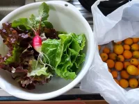 今日のお裾分けも先日と同じく、サニーレタス・チマサンチュ・紅白はつか大根・小ネギ・金柑です😊