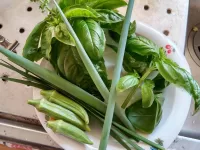 今日のお裾分けは、オクラ・バジル・ネギになります。 オクラはこれで今年は終了です。
