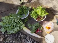 今日のお裾分けは、結球しなかった白菜と大根・はつか大根・巨大化した小ネギ・水菜・チマサンチュ・サニーレタス・金柑です😊